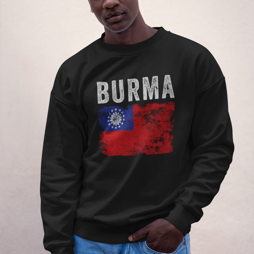 Fejr din arv med vores Distressed Burma Flag Sweatshirt. Vis din stolthed, støt dit land & bær dine farver med passion. Køb nu!