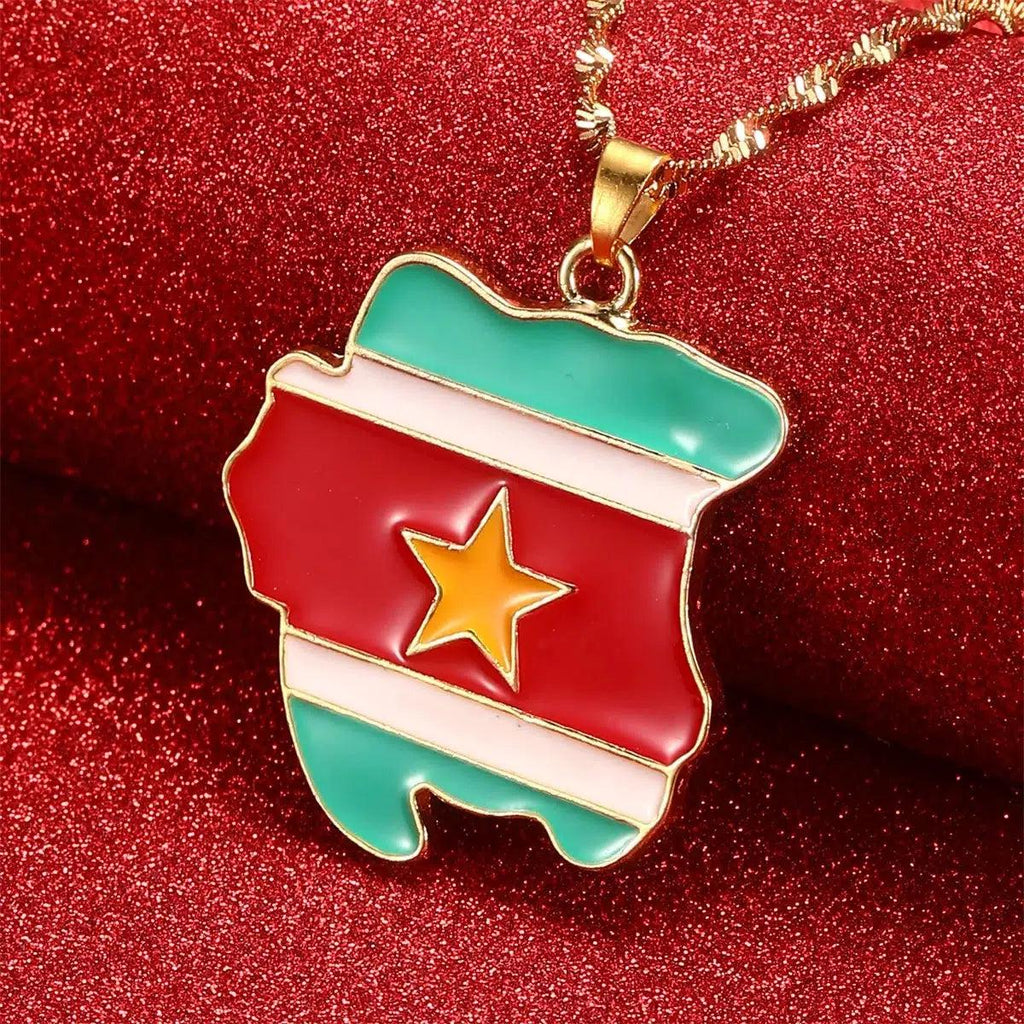 Fejr din arv med vores Suriname Flag Map Necklace. Vis din stolthed, støt dit land & bær dit vedhæng med passion. Køb nu!