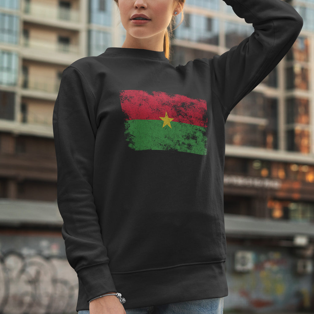 Feiern Sie Ihr Erbe mit unserem Sweatshirt mit der abgenutzten Flagge von Burkina Faso. Zeigen Sie Ihren Stolz, unterstützen Sie Ihr Land & tragen Sie Ihre Farben mit Leidenschaft. Jetzt kaufen!