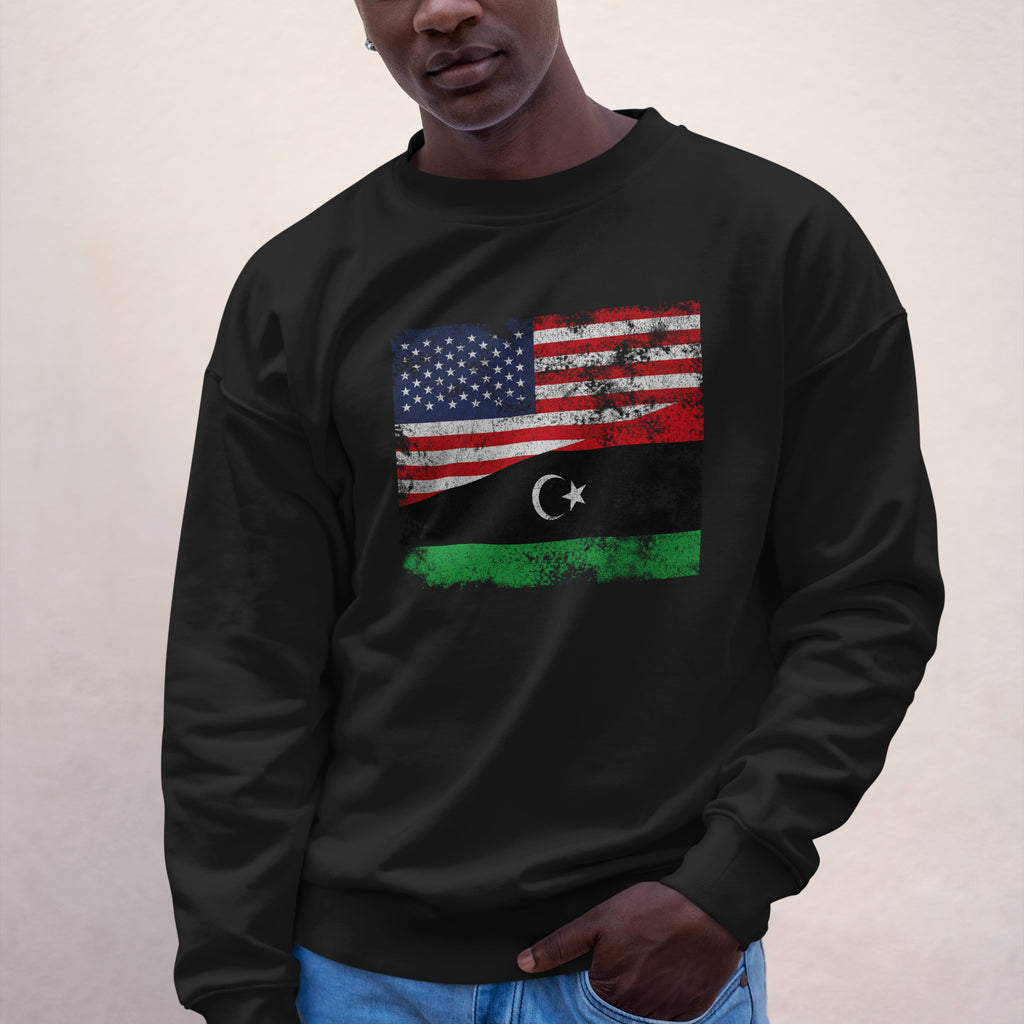 ディストレスト・リビアUSAフラッグスウェットシャツであなたのルーツを祝福しましょう。誇りを示し、国を応援し、情熱を持ってあなたの色を着用してください。