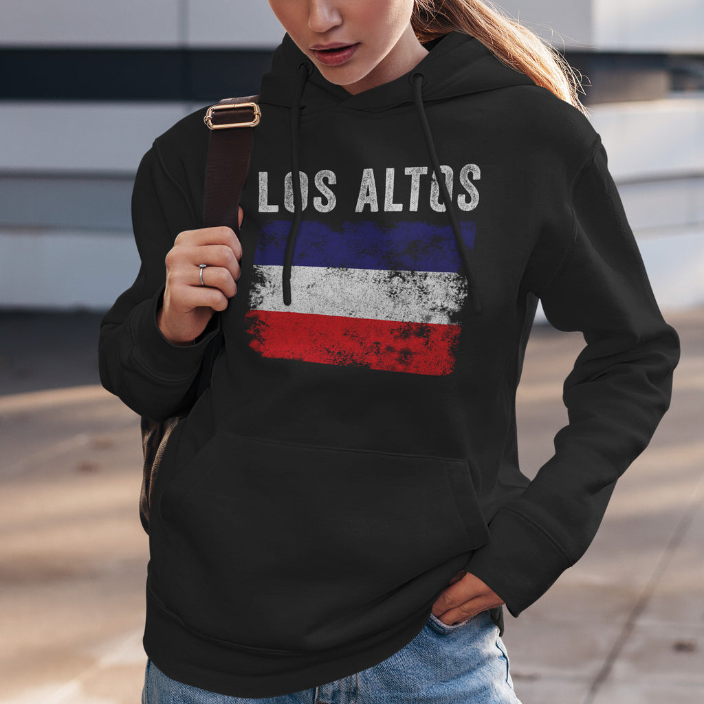 傷加工されたロスアルトス旗のフーディーであなたの遺産を祝福しましょう。誇りを示し、国を支援し、情熱を持ってあなたの色を着用してください。