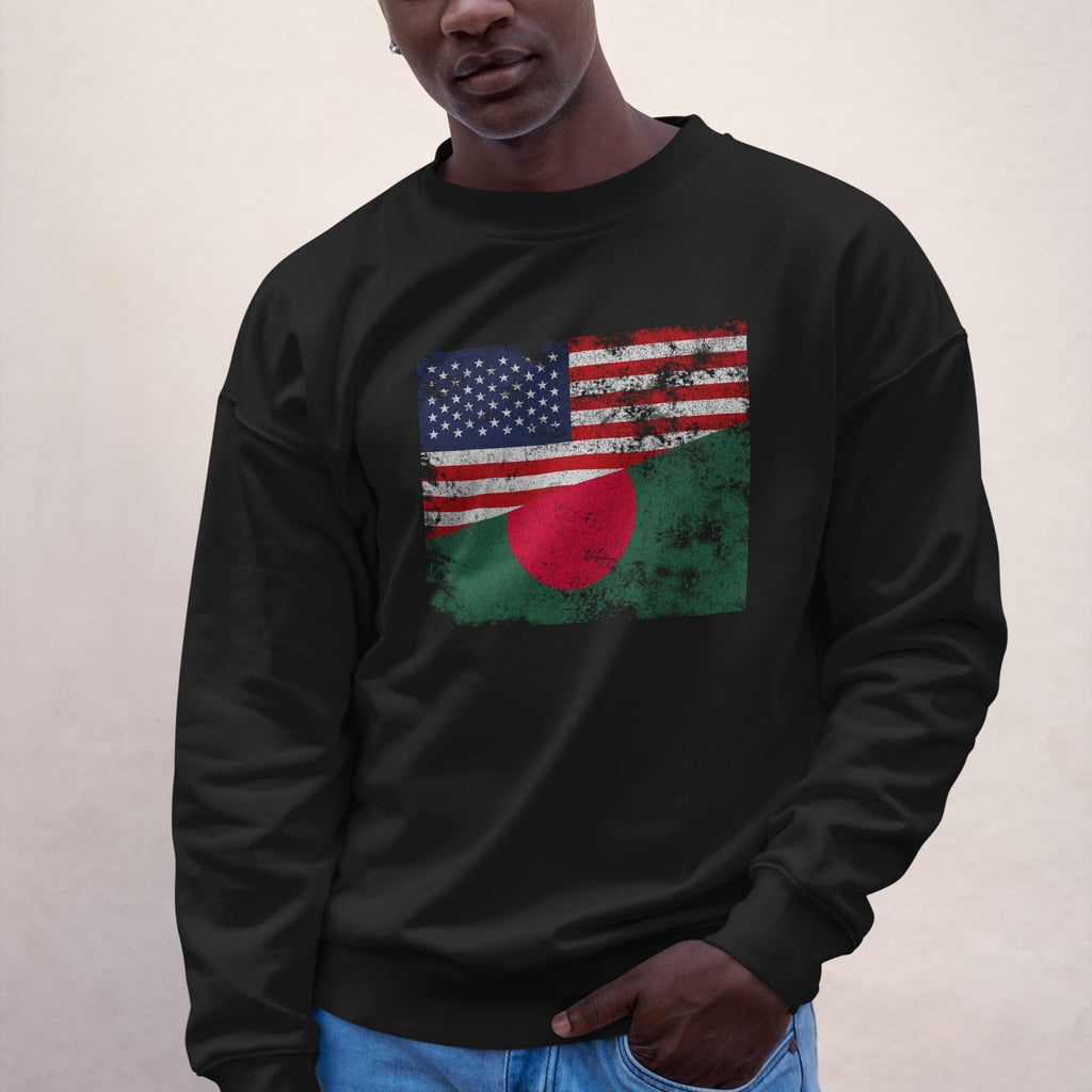 우리의 디스트레스드 방글라데시 미국 국기 스웨트셔츠로 당신의 유산을 기념하세요. 자부심을 보여주고, 나라를 응원하며, 열정적으로 당신의 색을 입으세요.