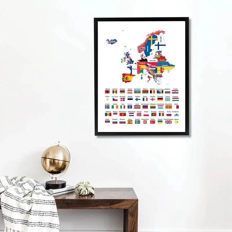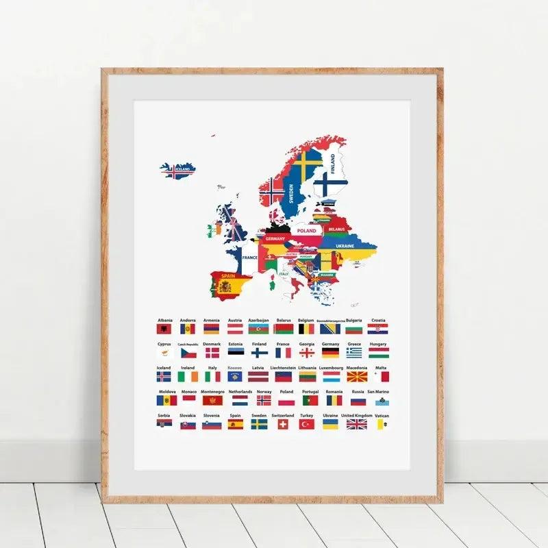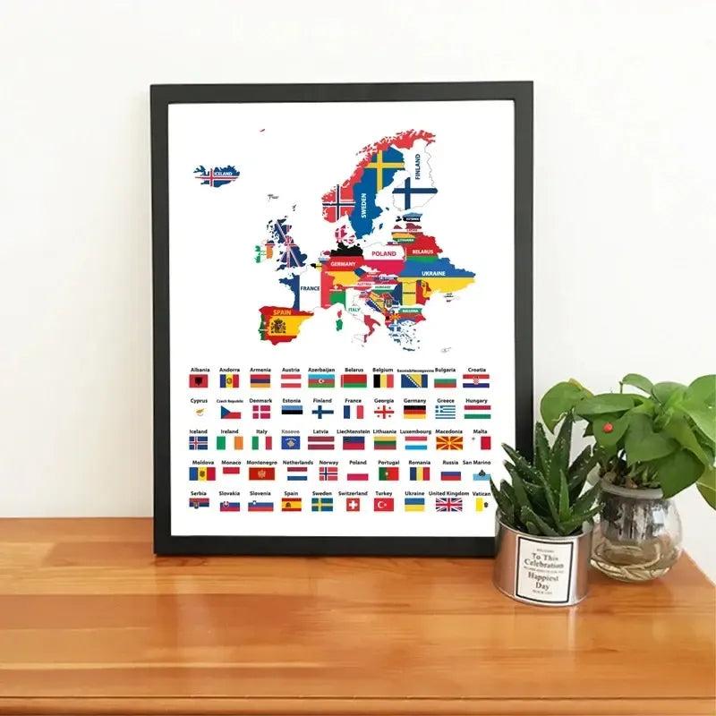 Celebrate European heritage with our Europe Flag Map Poster. Discover the flags of every European country in one colorful map. Perfect for home, office or classroom. Buy now!