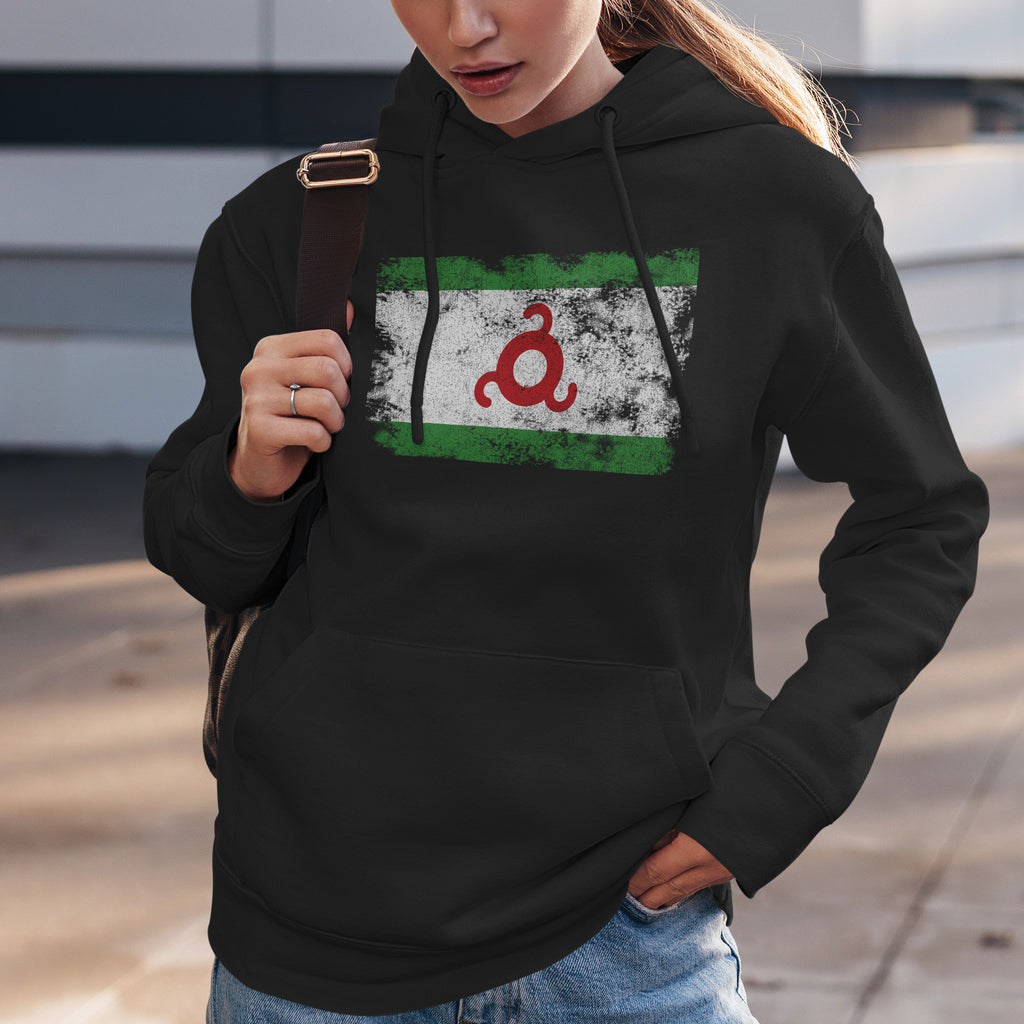 Vier je erfgoed met onze Versleten Ingusjetië Vlag Hoodie. Toon je trots, steun je land en draag je kleuren met passie. Koop nu!